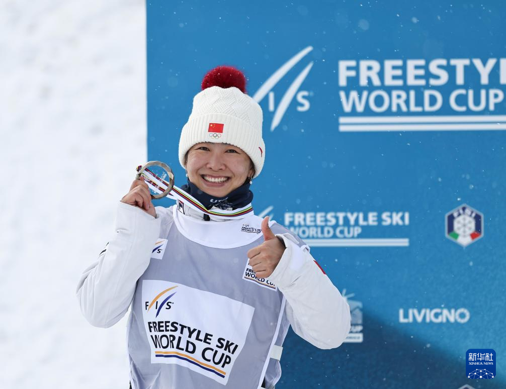 当日,国际雪联自由式滑雪世界杯女子空中技巧赛季前三名颁奖仪式在意大利利维尼奥镇举行,中国选手徐梦桃获得亚军。