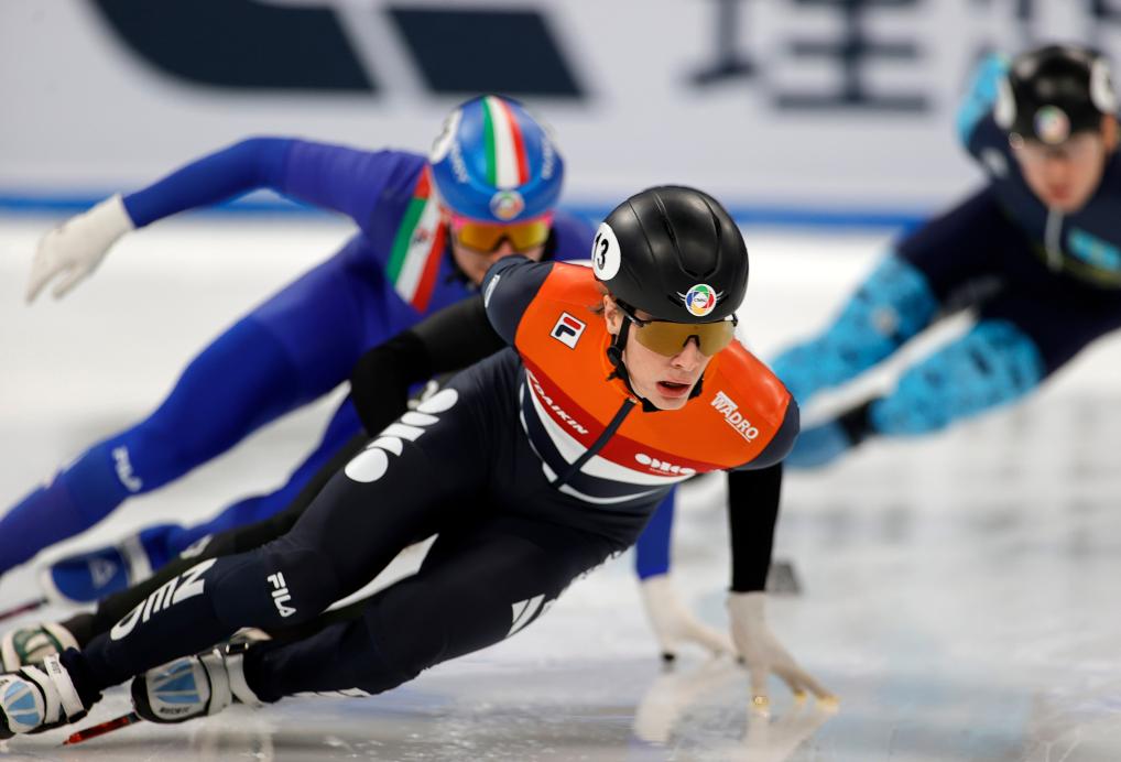 3月14日,在北京举行的2025年短道速滑世锦赛混合团体接力四分之一决赛中,荷兰队以2分35秒339的成绩打破世界纪录。图为荷兰队选手延斯·范特·沃特在比赛中。新华社记者 丁旭 摄