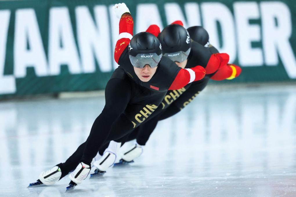 3月13日,在挪威哈马尔举行的速度滑冰世界锦标赛短距离男子团体追逐赛中,由薛智文、廉子文和宁忠岩组成的中国队以1分18秒13的成绩获得冠军。图为中国队选手薛智文、廉子文、宁忠岩(从前至后)在比赛中。新华社/路透