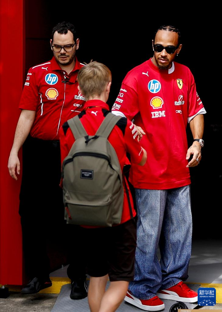 3月15日,法拉利车队英国车手汉密尔顿(右)与粉丝互动。