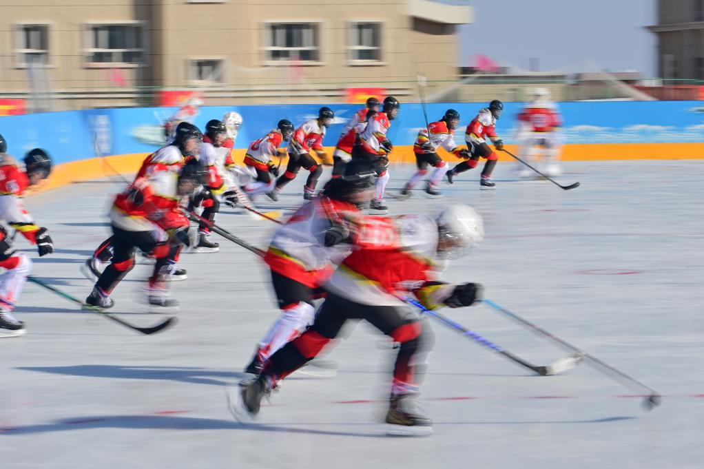 2月21日,在新疆乌鲁木齐县第一中学,学校冰球队队员在体育课上训练。新华社记者 丁磊 摄