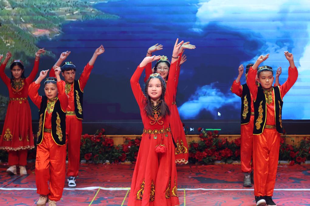 来自新疆和田地区的学生们在舞台上身着民族服饰进行舞蹈表演。