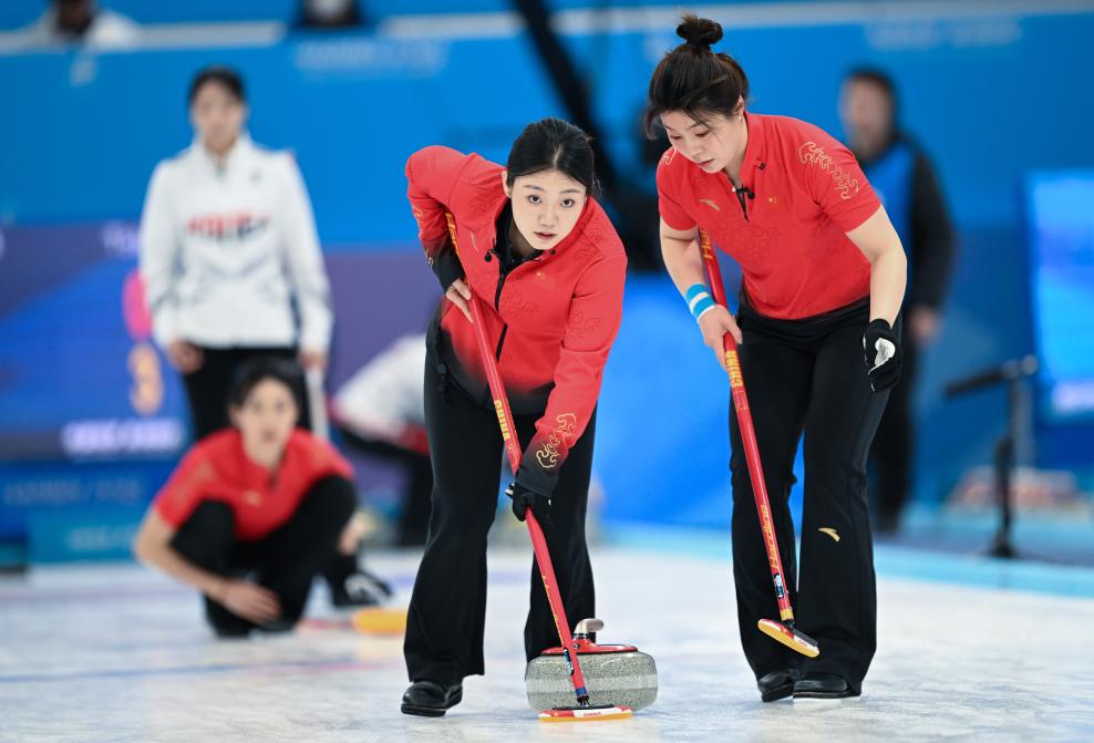2月14日,在哈尔滨举行的第九届亚冬会冰壶女子金牌赛中,中国队选手董子齐(右)、韩雨在比赛中擦冰。