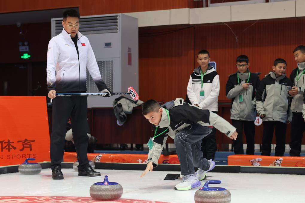 阿卜杜热合曼(右一)在教练的指导下体验投掷冰壶。