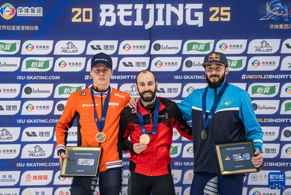 3月15日,冠军加拿大选手杜波依斯(中)、亚军哈萨克斯坦选手丹尼斯·尼基沙(右)和季军荷兰选手延斯·范特·沃特在颁奖仪式上合影。