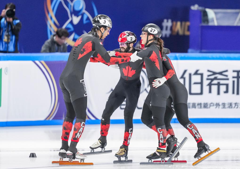 3月16日,加拿大队选手在混合团体接力决赛后庆祝夺冠。新华社记者 孙非 摄