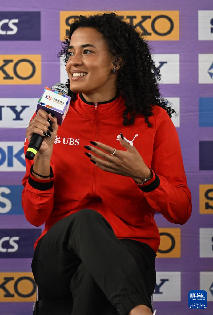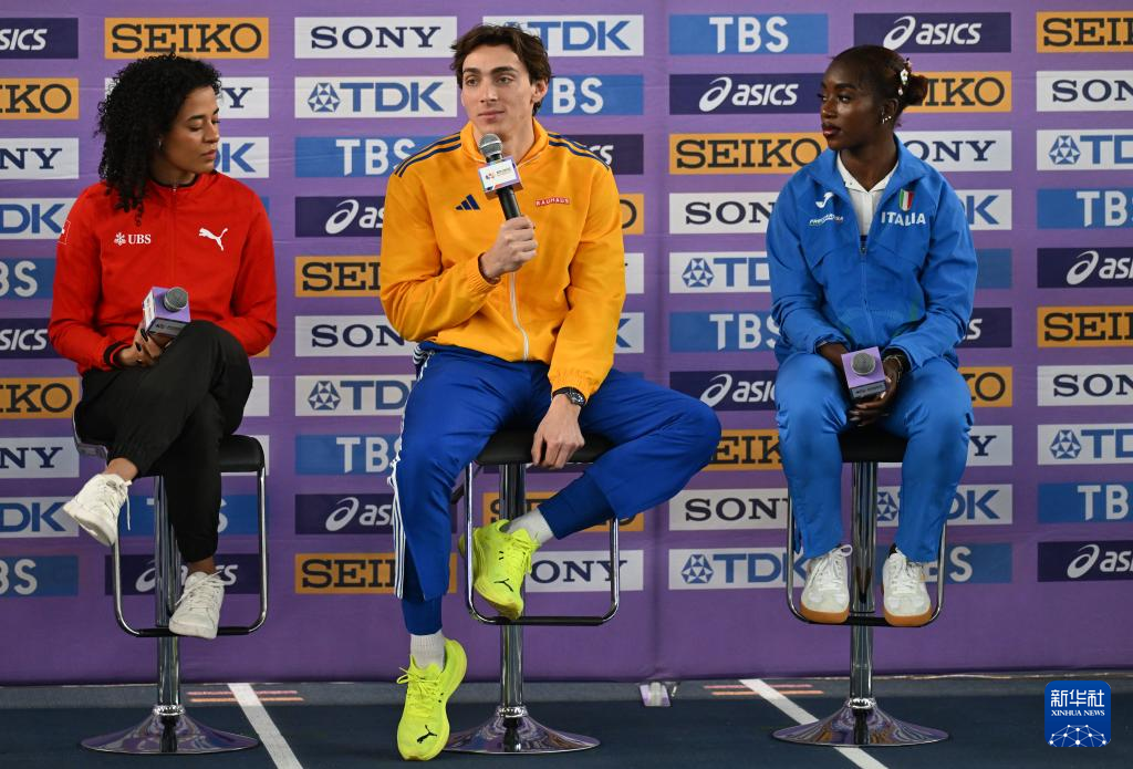 3月20日,瑞士运动员迪塔吉·坎邦吉、瑞典运动员杜普兰蒂斯和意大利运动员扎伊纳布·多索(从左到右)在发布会上。
