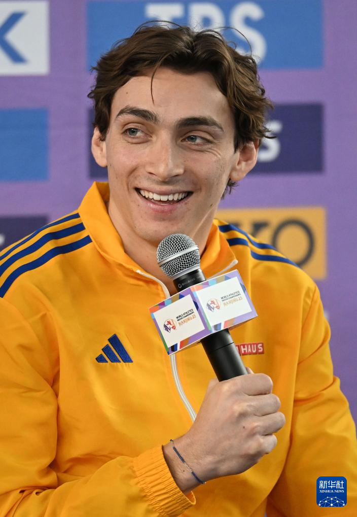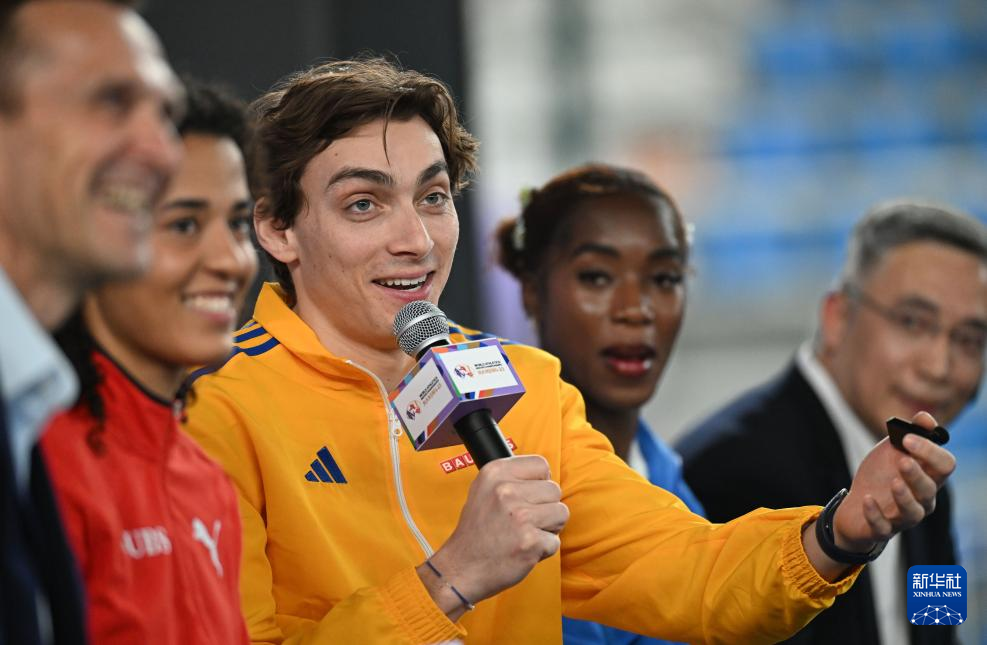 3月20日,瑞典运动员杜普兰蒂斯在发布会上。