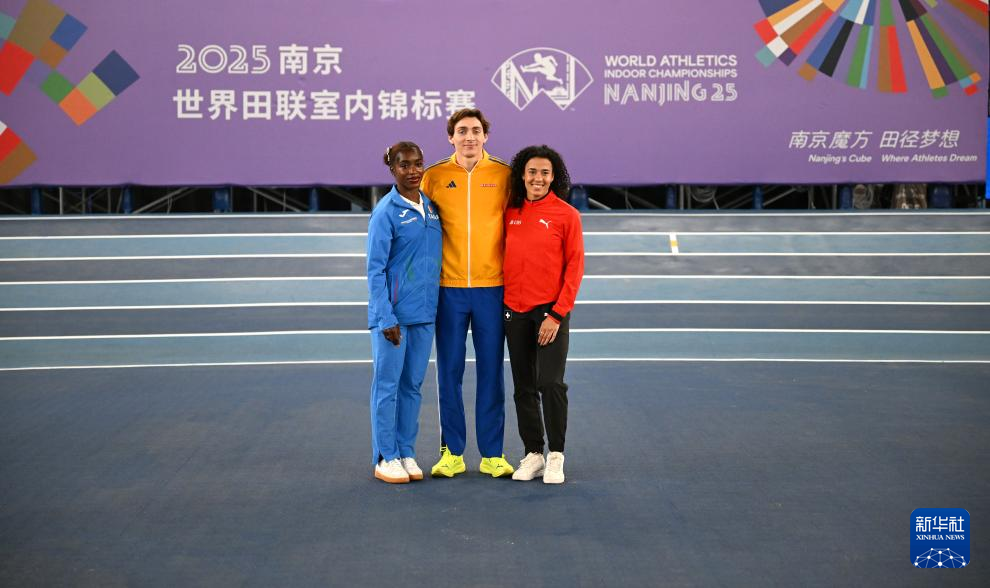 3月20日,意大利运动员扎伊纳布·多索、瑞典运动员杜普兰蒂斯和瑞士运动员迪塔吉·坎邦吉(从左到右)在发布会后合影。