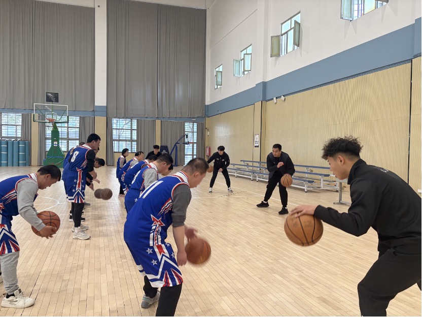 正带领患有唐氏综合征的学生上篮球课