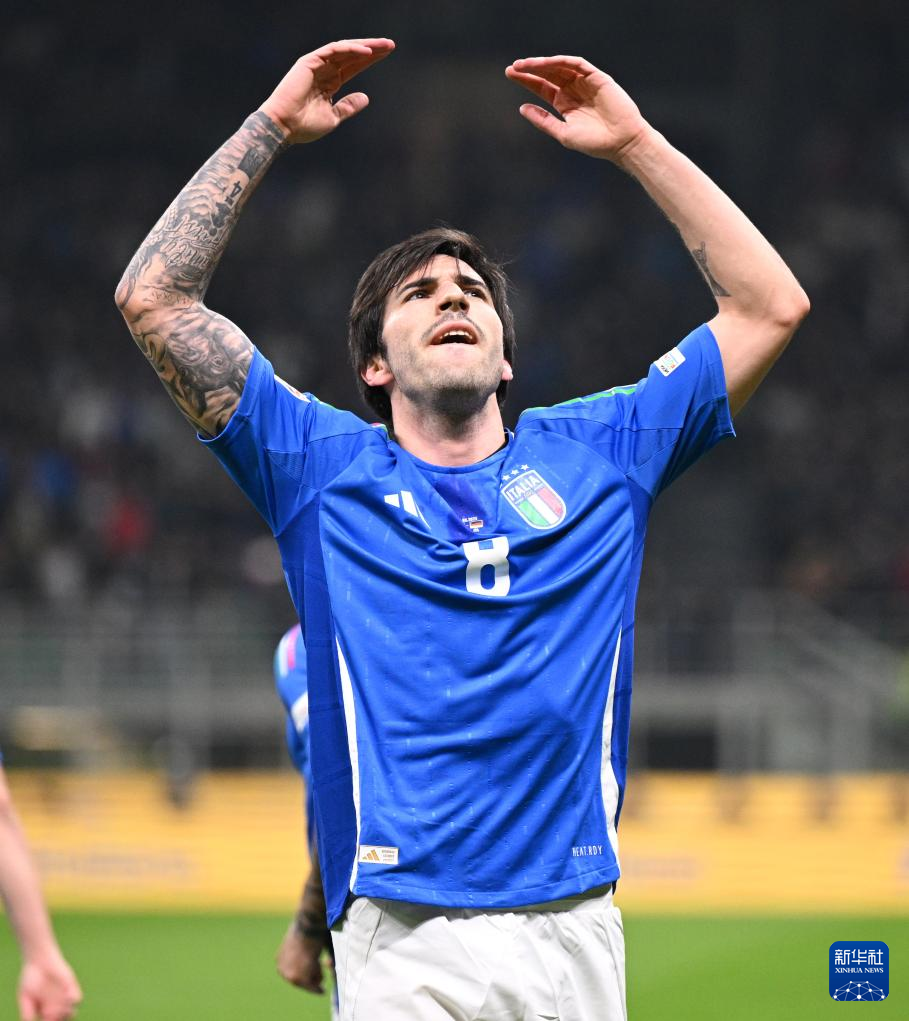 3月20日,意大利队球员托纳利在比赛中庆祝进球。