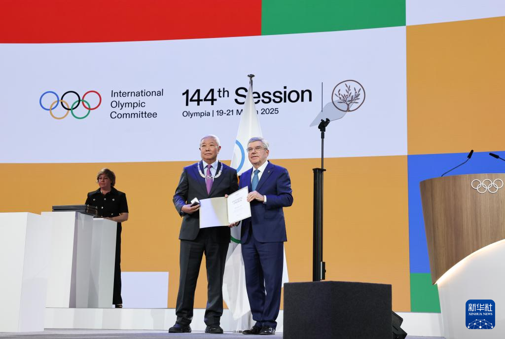 3月21日,国际奥委会委员于再清(左)在受颁奥林匹克奖章后发言。