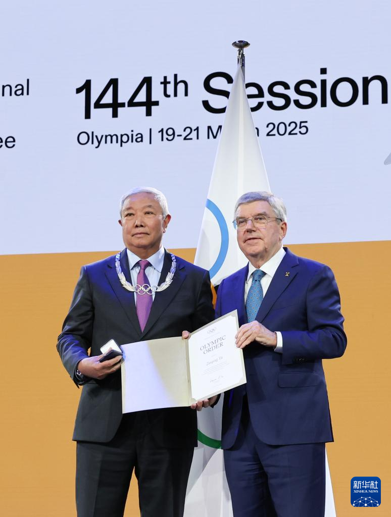 3月21日,国际奥委会主席巴赫(右)向国际奥委会委员于再清颁发奥林匹克奖章。