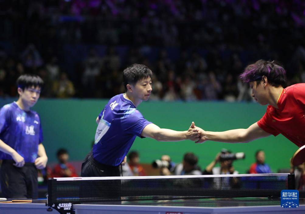 3月22日,北京八喜队选手马龙(中)与辽宁队选手杨硕击掌。他与队友王楚钦3比0战胜辽宁队组合杨硕/袁励岑。