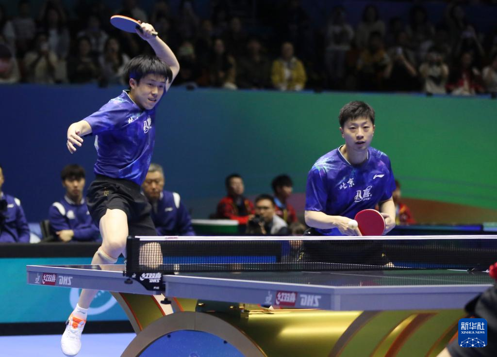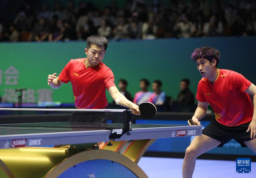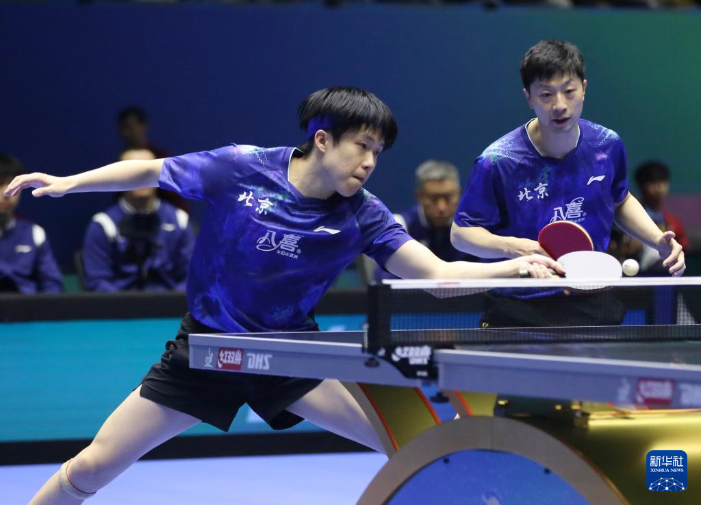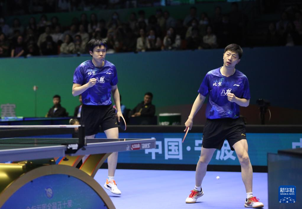 3月22日,北京八喜队组合马龙/王楚钦(左)在比赛中。他们3比0战胜辽宁队组合杨硕/袁励岑。