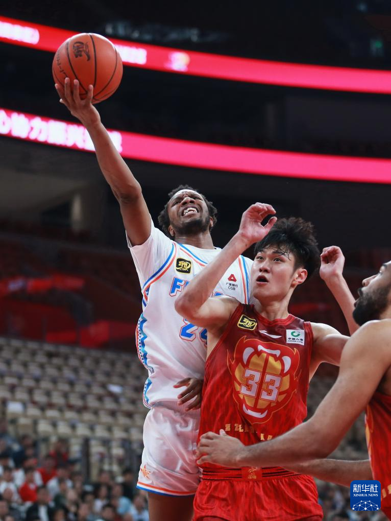 3月23日,福建晋江文旅队球员路易斯·金(左)在比赛中上篮。