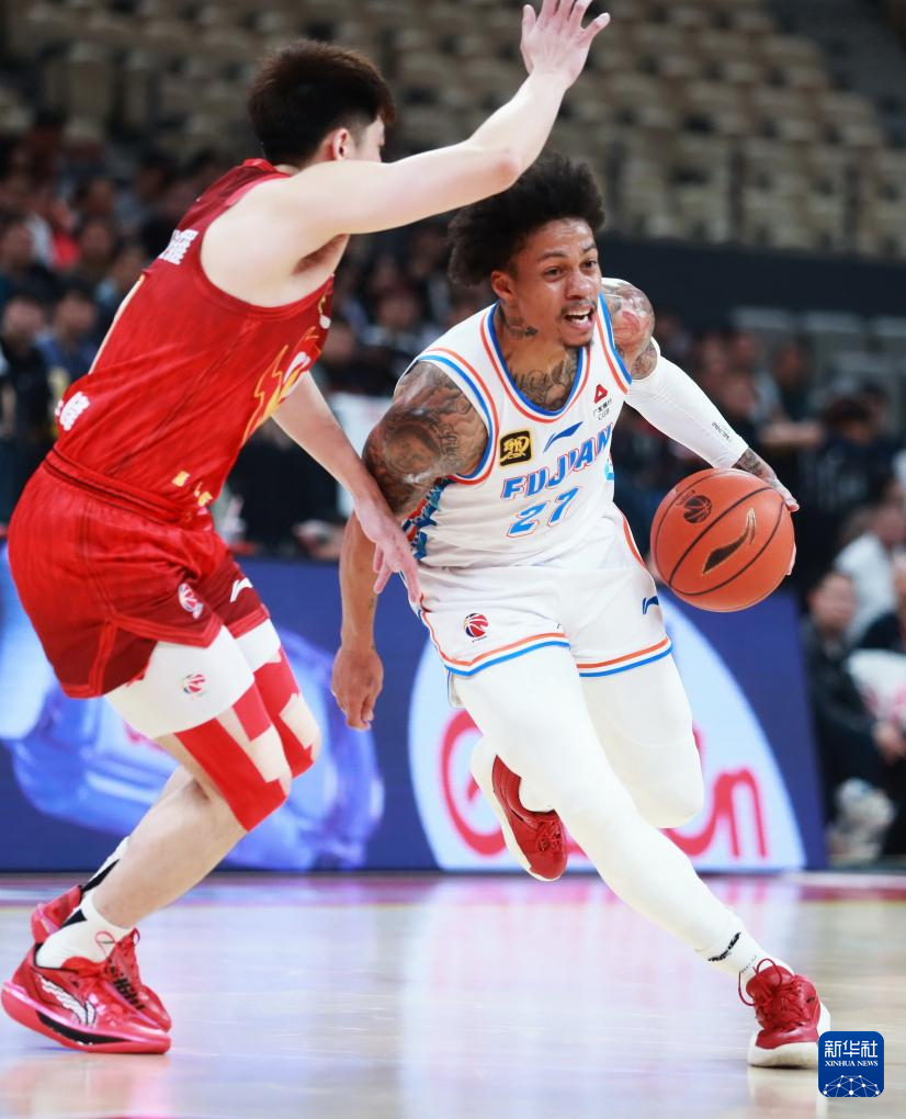 3月23日,福建晋江文旅队球员约瑟夫·杨(右)在比赛中带球突破。