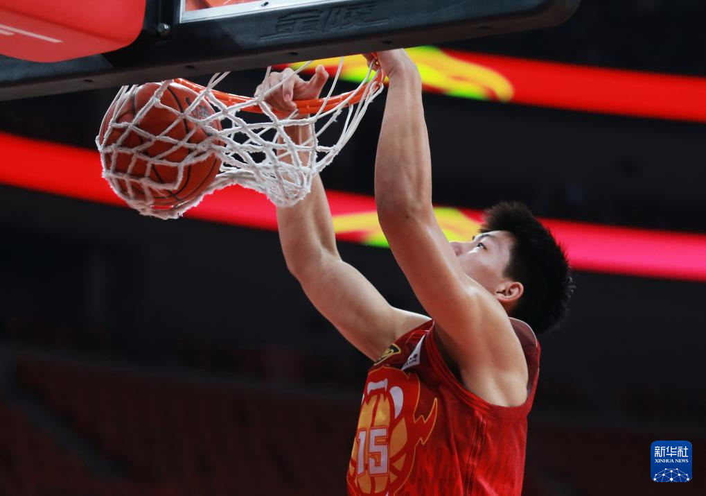 3月23日,福建晋江文旅队球员贝利·斯蒂尔(上)在比赛中扣篮。