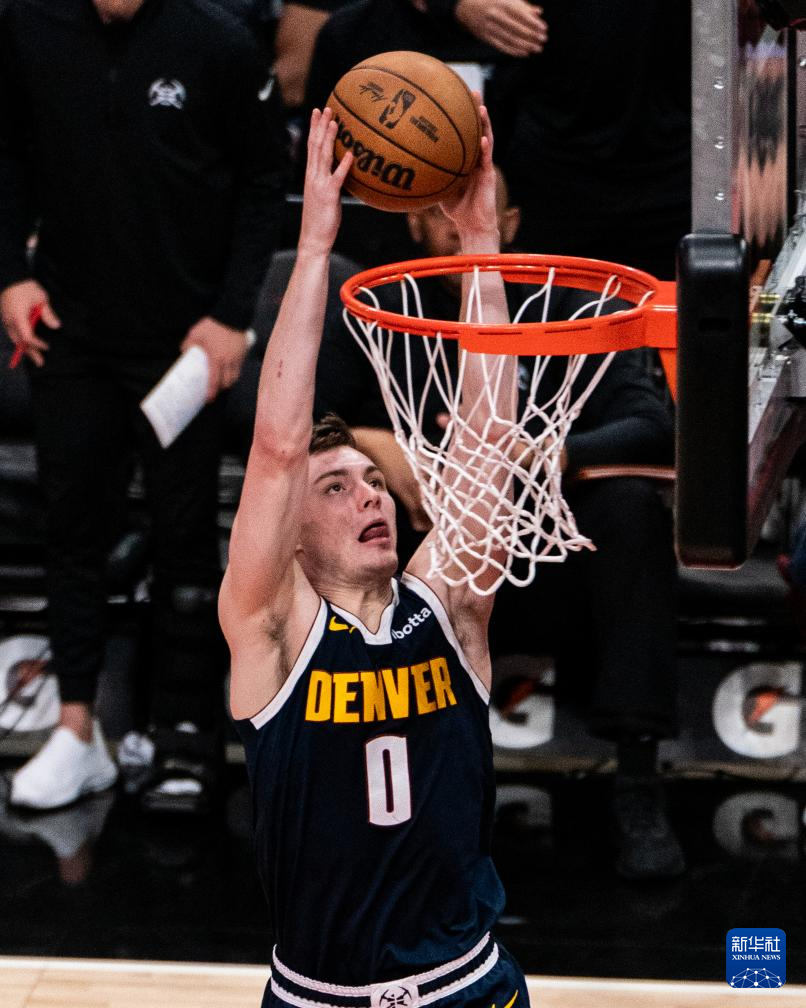 3月23日,掘金队球员克里斯蒂安·布劳恩在比赛中扣篮。