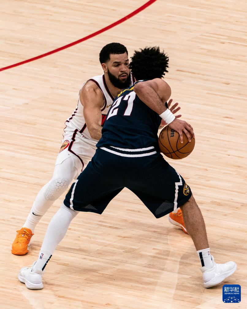 3月23日,火箭队球员弗雷德·范弗里特(左)在比赛中防守掘金队球员贾马尔·穆雷。