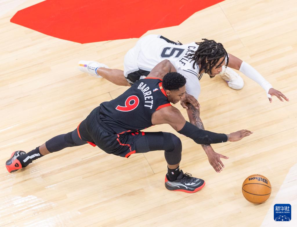 3月23日,猛龙队球员巴雷特(左)与马刺队球员卡斯尔在比赛中拼抢。