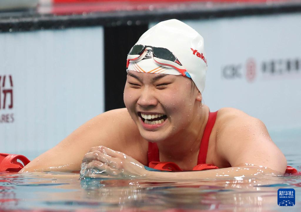 3月23日,浙江寿仙谷队选手柳雅欣在女子200米自由泳决赛后庆祝。最终她以1分54秒96的成绩获得冠军。