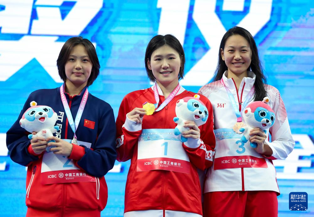 3月23日,冠军浙江寿仙谷队选手叶诗文(中)、亚军湖北浩沙队选手孔姝雅(左)和季军北京体彩队选手于静瑶在女子100米蛙泳项目颁奖仪式上合影。