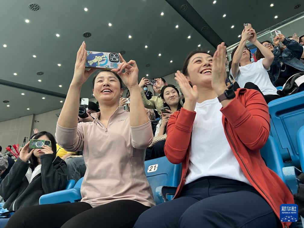 3月23日,江苏洲克队选手张雨霏的母亲张敏(中)在现场观看比赛。