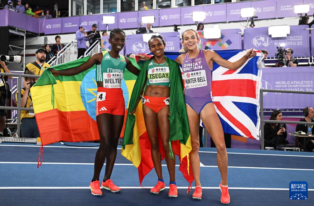 3月23日,冠军埃塞俄比亚选手策盖(中)、亚军韦尔特基(左)和季军英国选手贝尔在决赛后庆祝。