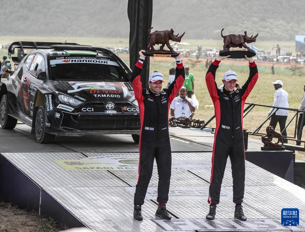 3月23日,在肯尼亚奈瓦沙举办的第73届肯尼亚萨法里拉力赛上,冠军丰田车队英国车手埃尔芬·埃文斯(上右)与领航员斯科特·马丁(上左)在颁奖仪式上庆祝。