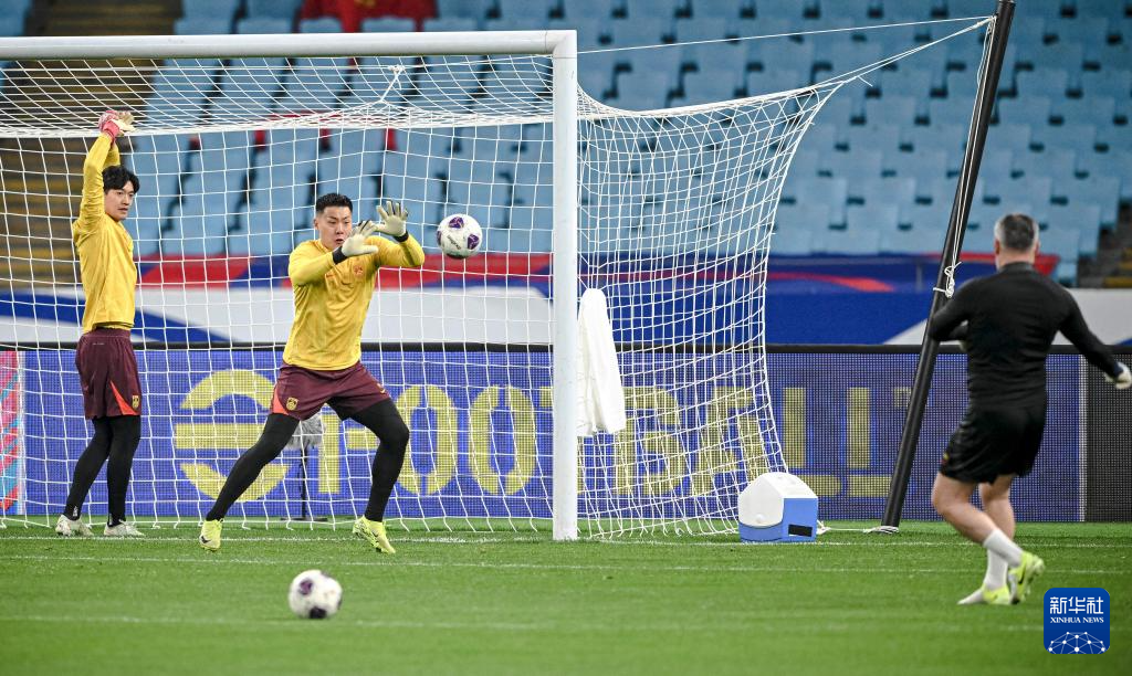 3月24日,中国队守门员王大雷(中)、颜骏凌(左)在赛前训练中。