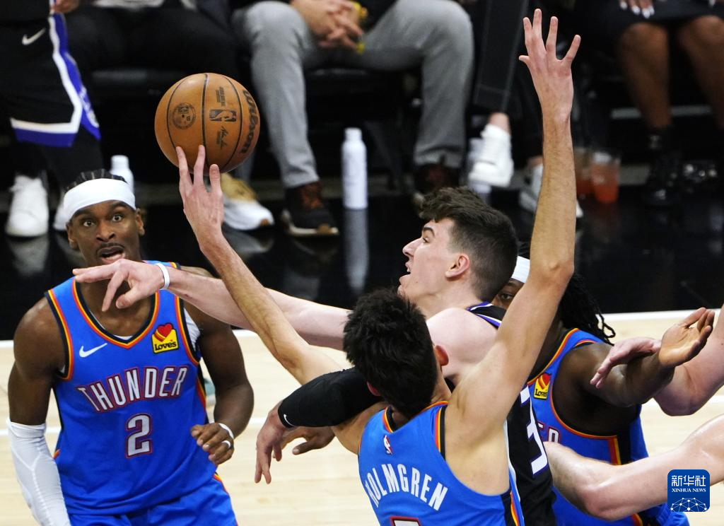3月25日,雷霆队球员吉尔杰斯-亚历山大(左二)在比赛中拼抢。