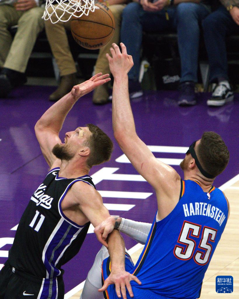 3月25日,国王队球员萨博尼斯(右)在比赛中上篮。
