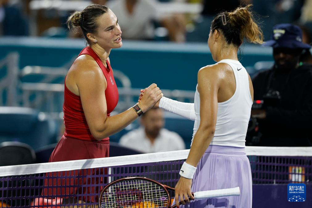 3月25日,萨巴伦卡(左)和郑钦文在赛后握手致意。