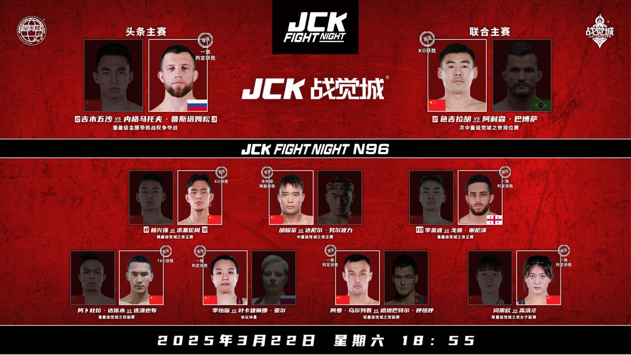 2025年3月22日,JCK觉城之夜N96落下战幕,头条主赛内格马托夫·鲁斯塔姆松一致判定战胜吉木五沙,拿到金腰带挑战权;联合主赛色吉拉胡KO阿利森·巴博萨;正赛部分求基伦周53秒KO杨兴强、胡耀宗木村锁降服达尼尔·努尔波力、格鲁吉亚选手戈查·谢尼泽捍卫职业生涯7战不败;男子副赛连渣也布TKO阿卜杜拉·达依木、阿曼·乌尔列吾一致判定战胜蒙古国选手;女子副赛李怡璇斩获5连胜、高浣珺战胜闫雨欣。