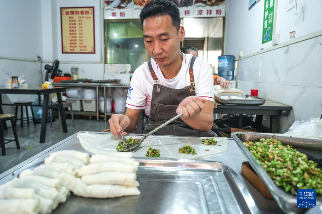 董永恒在榕江县亲戚家的卷粉店制作卷粉(3月27日摄)。新华社发(王炳真 摄)