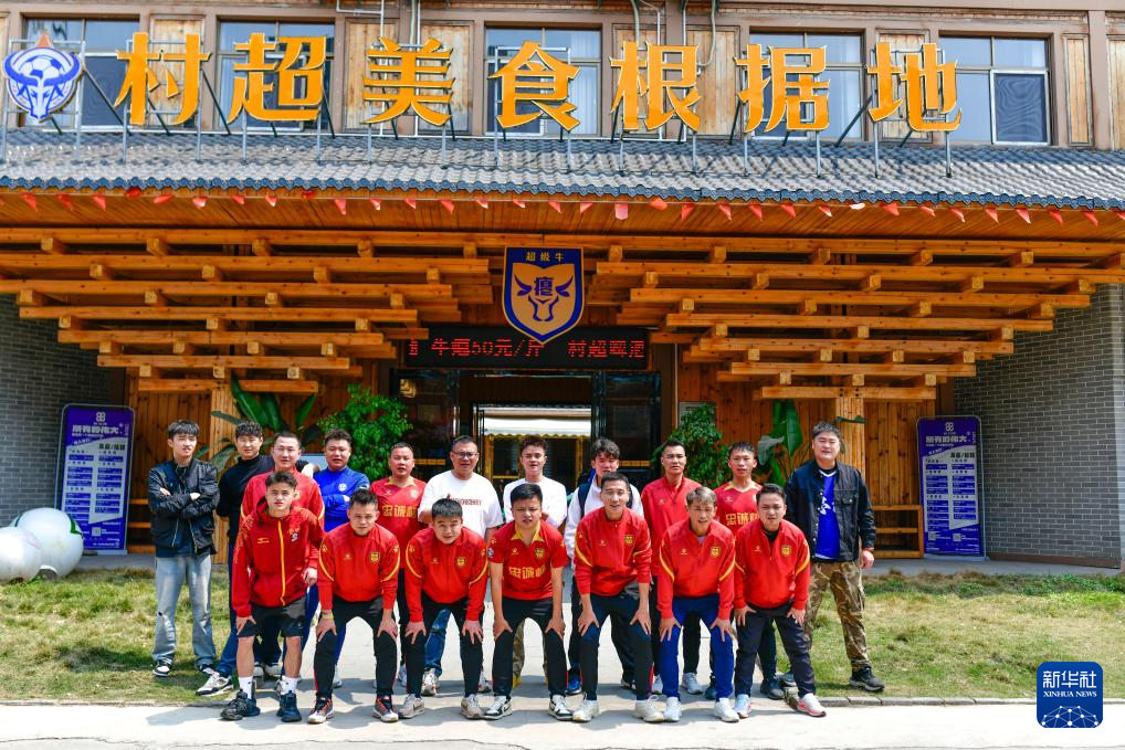 董永恒(前排右三)在“村超”美食根据地餐馆前与忠诚村队的队友们合影(3月23日摄)。新华社记者 杨文斌 摄