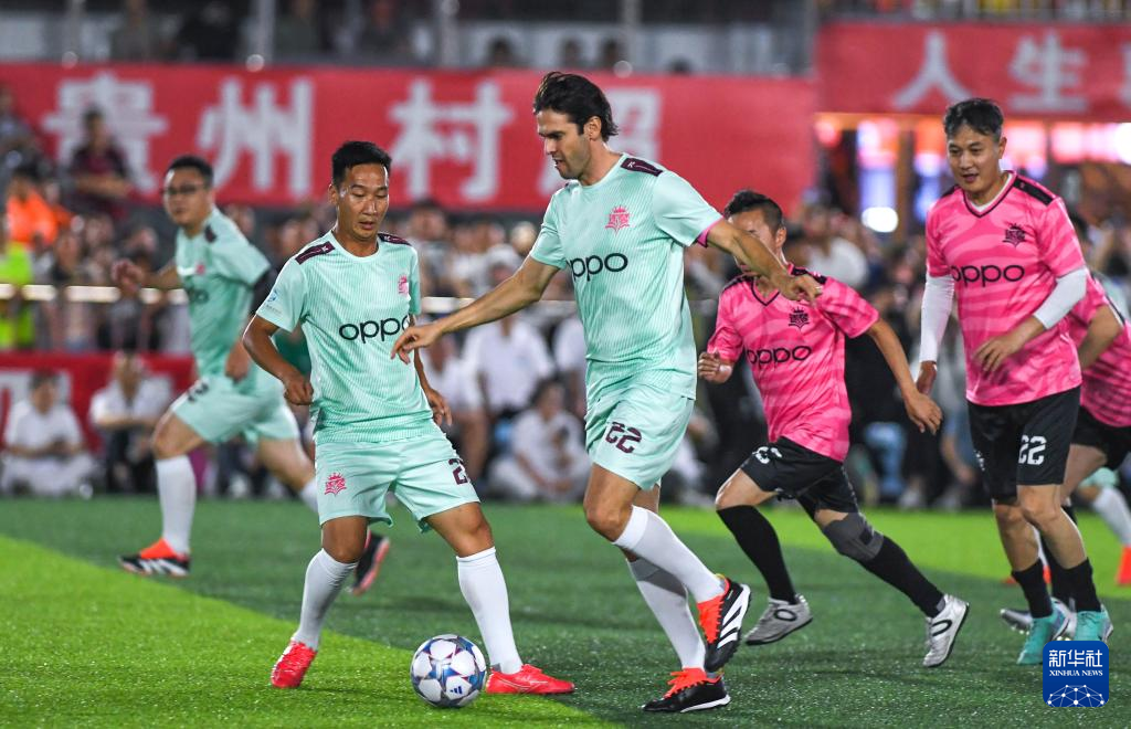董永恒(左二)与巴西足坛名宿卡卡(左三)在“逐梦”冠军明星公益赛中(2024年5月27日摄)。新华社记者 杨文斌 摄