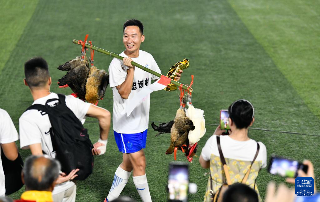 在2023年“村超”总决赛颁奖仪式上,董永恒展示获得的最佳射手金靴奖杯和奖品——榕江小香鸡(2023年7月29日摄)。新华社记者 杨文斌 摄