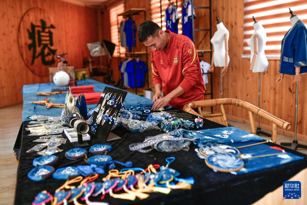 董永恒在“村超”美食根据地餐馆展厅里整理文创产品(3月23日摄)。新华社记者 杨文斌 摄
