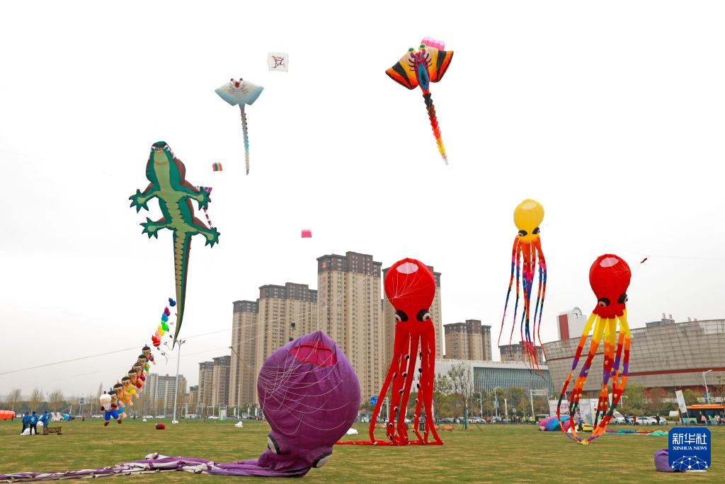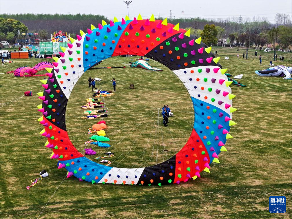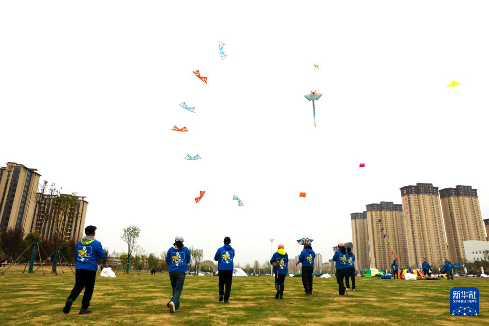 3月29日,参赛选手在活动现场放飞风筝(无人机照片)。