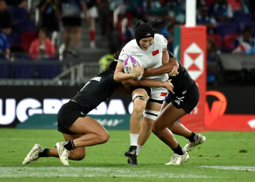 3月28日,中国队球员陈子盈(中)在比赛中进攻。当日,在香港国际七人橄榄球赛女子A组比赛中,中国队0:45不敌新西兰队。新华社发(卢炳辉 摄)