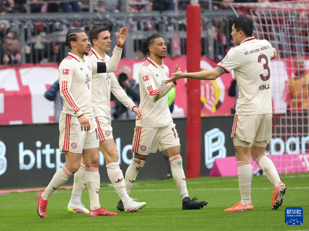 3月29日,拜仁慕尼黑队球员萨内(左一)打进球队第三粒进球后与队友庆祝。新华社发(菲利普·鲁伊兹摄)