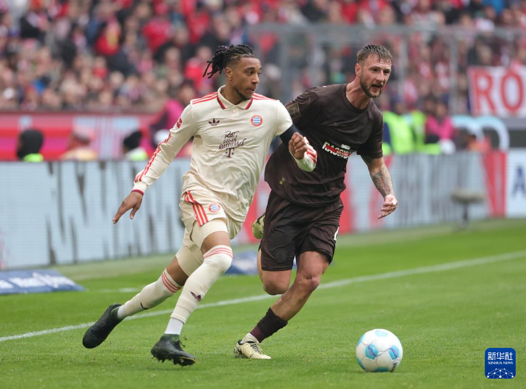 3月29日,拜仁慕尼黑队球员穆夏拉(右)与圣保利队球员范德海登在比赛中拼抢。新华社发(菲利普·鲁伊兹摄)