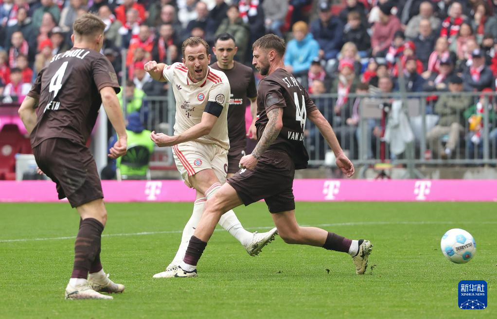 3月29日,拜仁慕尼黑队球员凯恩(中)在比赛中射门。新华社发(菲利普·鲁伊兹摄)