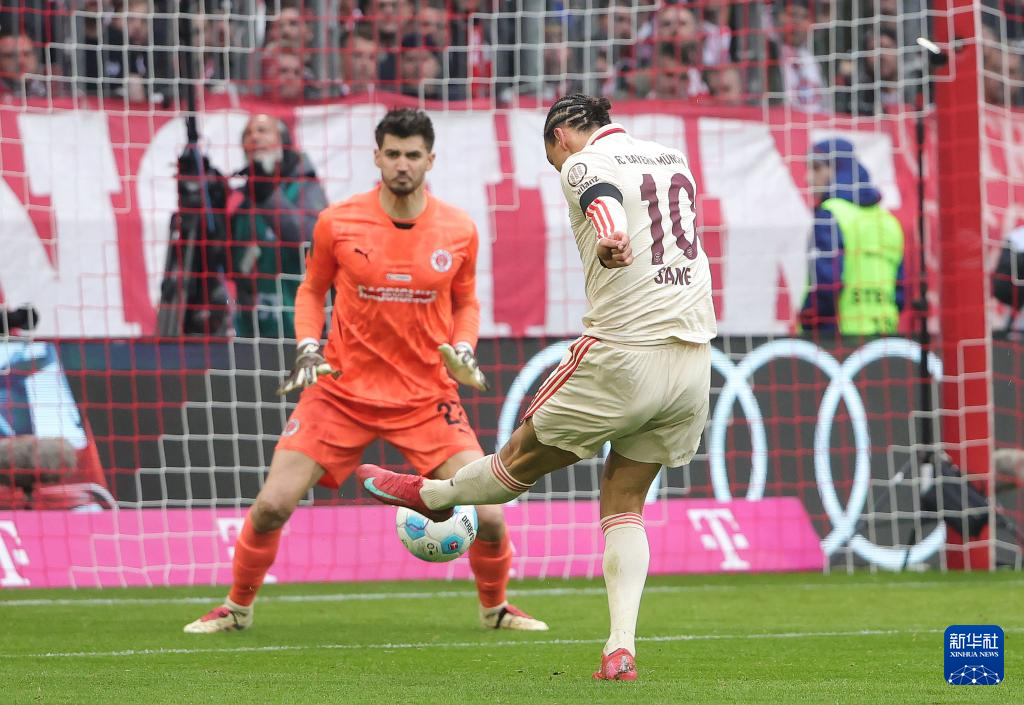 3月29日,拜仁慕尼黑队球员萨内(右)在比赛中打入球队第三粒进球。新华社发(菲利普·鲁伊兹摄)