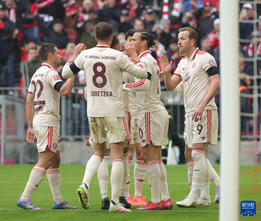 3月29日,拜仁慕尼黑队球员凯恩(右一)打进球队第一粒进球后与队友庆祝。新华社发(菲利普·鲁伊兹摄)