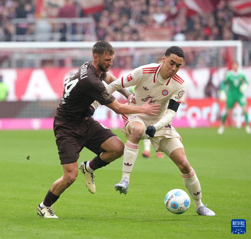3月29日,拜仁慕尼黑队球员穆夏拉(右)与圣保利队球员史密斯在比赛中拼抢。新华社发(菲利普·鲁伊兹摄)