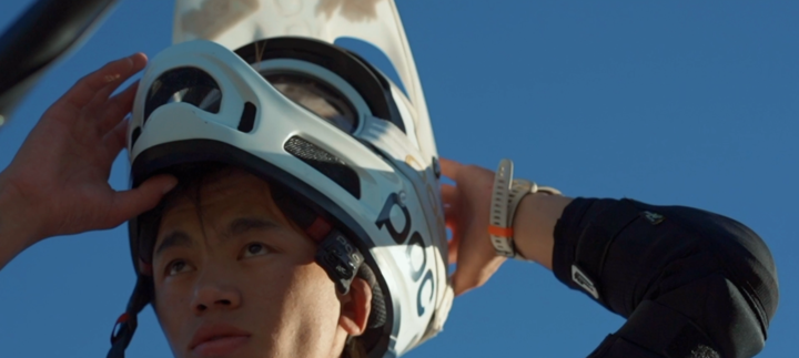 ↑旦增吉美戴上头盔准备骑车速降