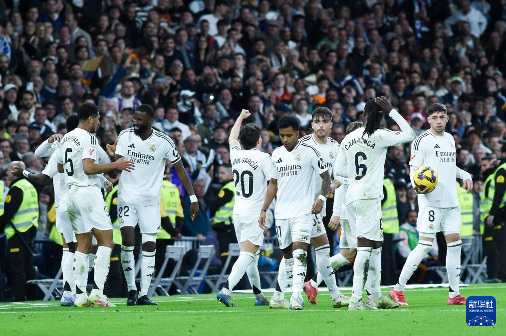 3月29日,皇家马德里队球员在比赛中庆祝进球。新华社发(古斯塔沃·巴连特摄)